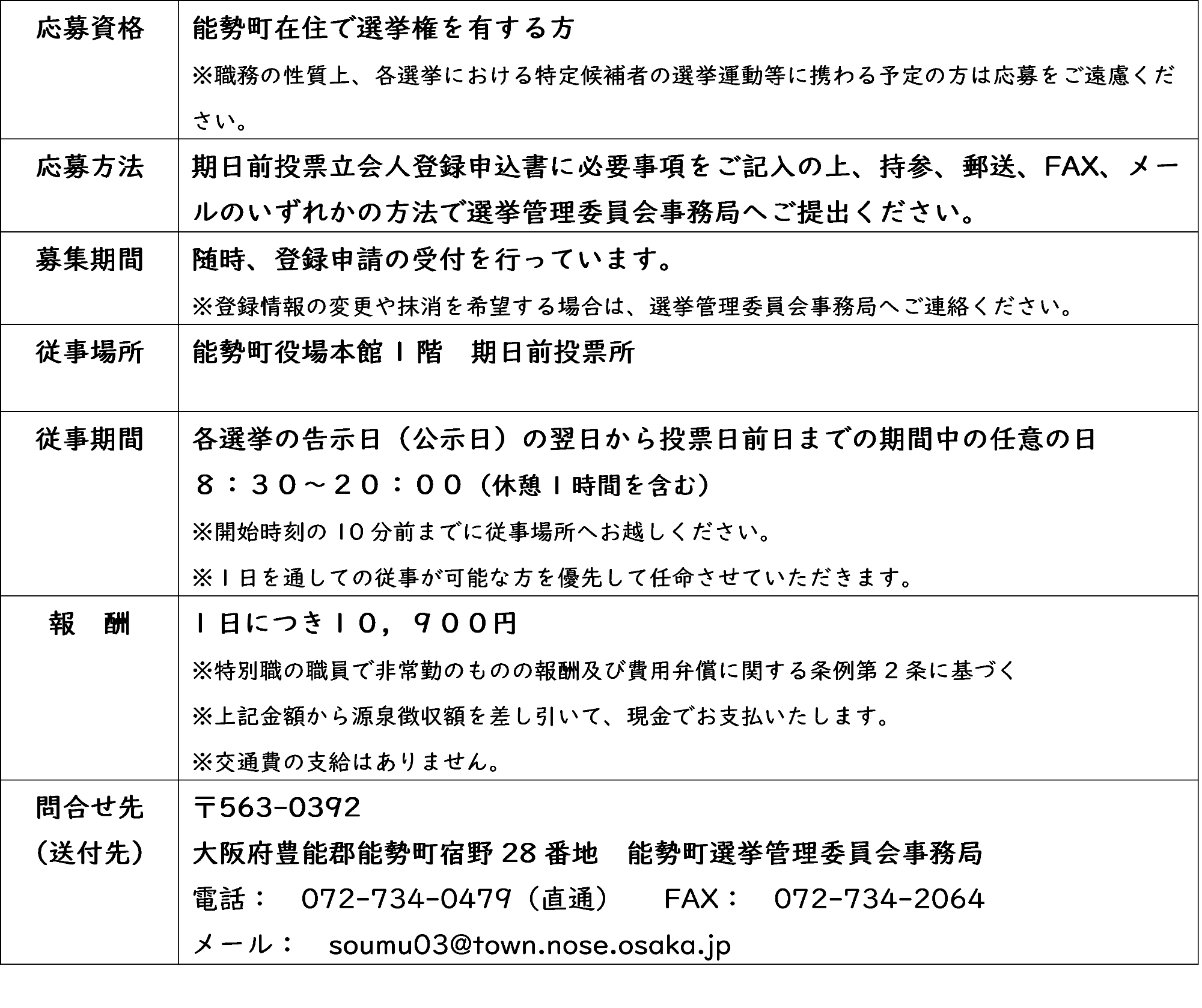 能勢町選挙管理委員会では、町民の皆さまが選挙や政治に主体的に関わる機会を増やし、選挙の重要性をより身近に感じていただくため、能勢町内で行われる選挙における【期日前投票所の投票立会人】を随時募集します。