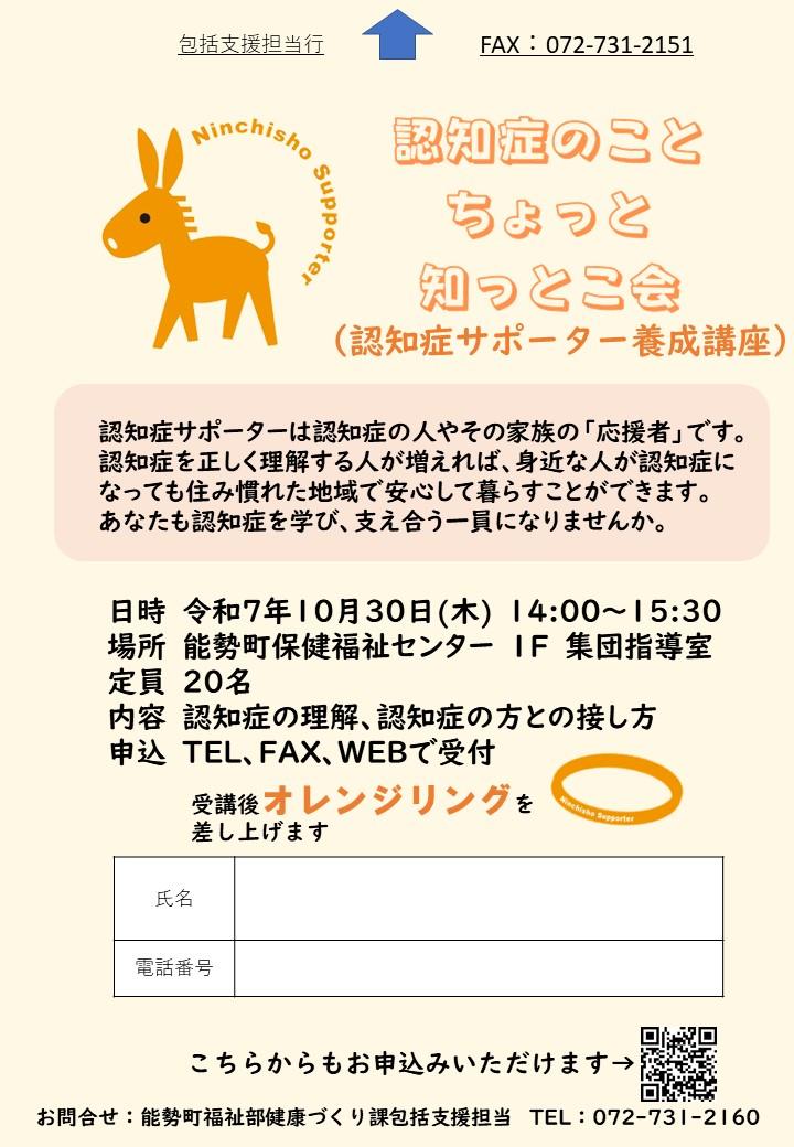 認知症ちょっと知っとこ会(認知症サポーター養成講座)のお知らせ