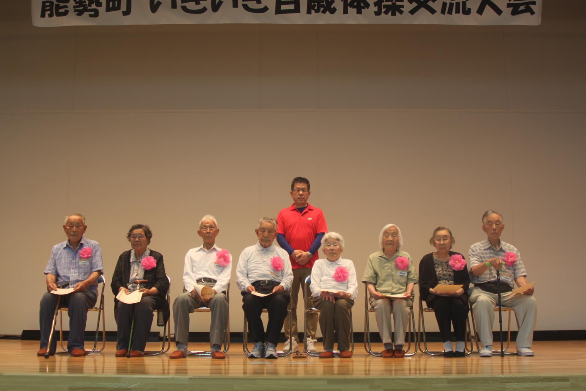 大会では、90歳以上の方で「いきいき百歳体操」に3か月以上継続して取り組まれている16名の方(当日は8名出席)に「お元気で頑張ったで賞」が町長から授与されました。引き続きお元気に体操に取り組まれている姿は、いきいき百歳体操に参加されている方の励みになっています。