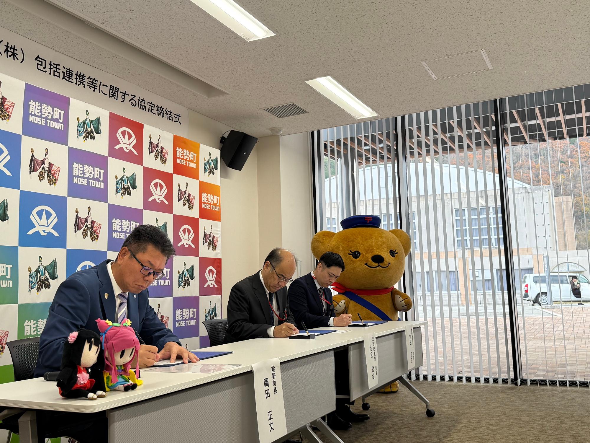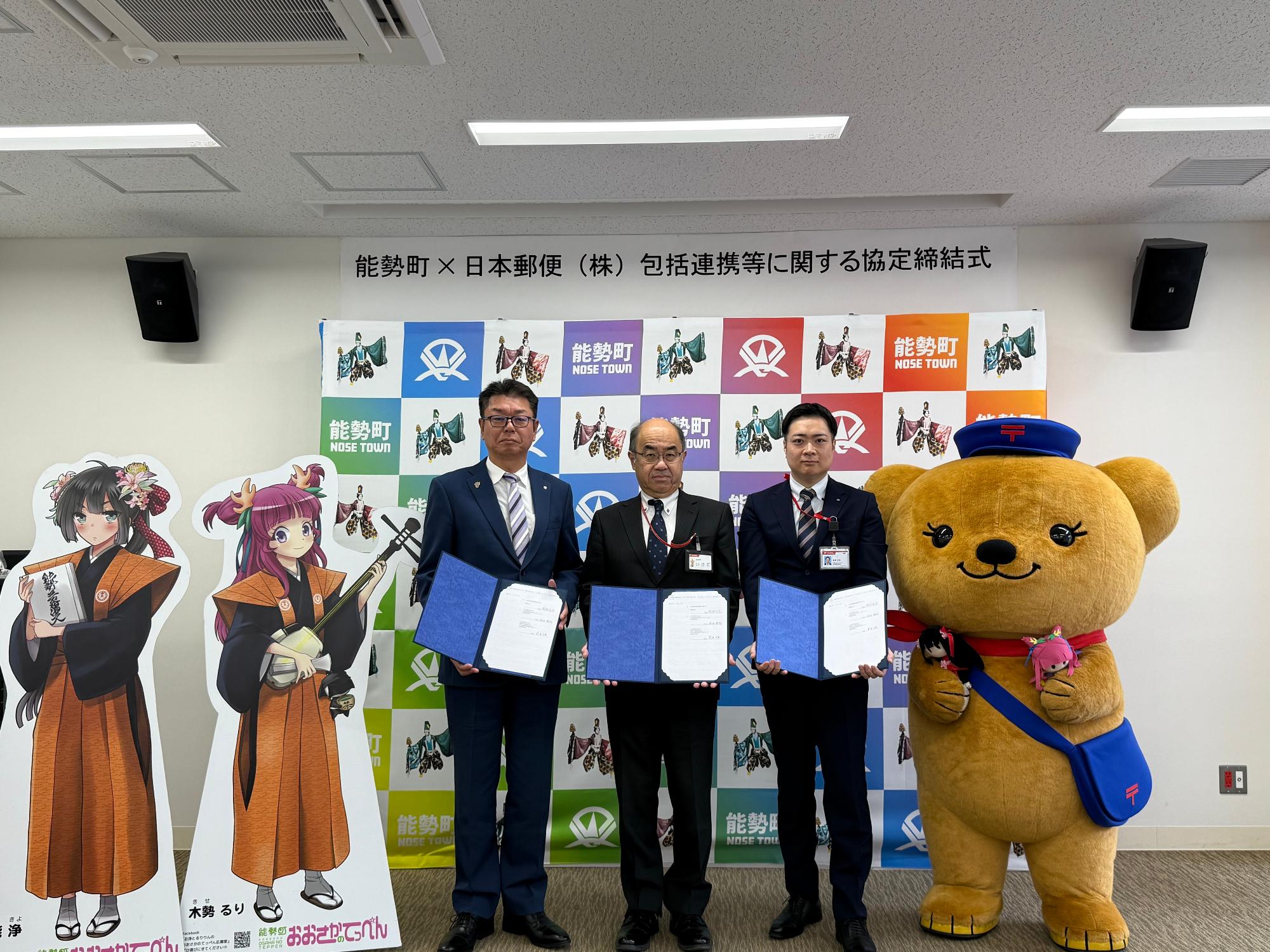 能勢町と日本郵便株式会社は令和7年12月3日に包括連携協定及び防災、熱中症対策に係る各協定を締結しました。この協定に基づき、道路損傷及び不法投棄等に係る情報連携や災害発生時における相互協力、クーリングシェルターの指定(町内3郵便局)など住民サービスの向上・地域活性化に向けた取組を更に推進します。