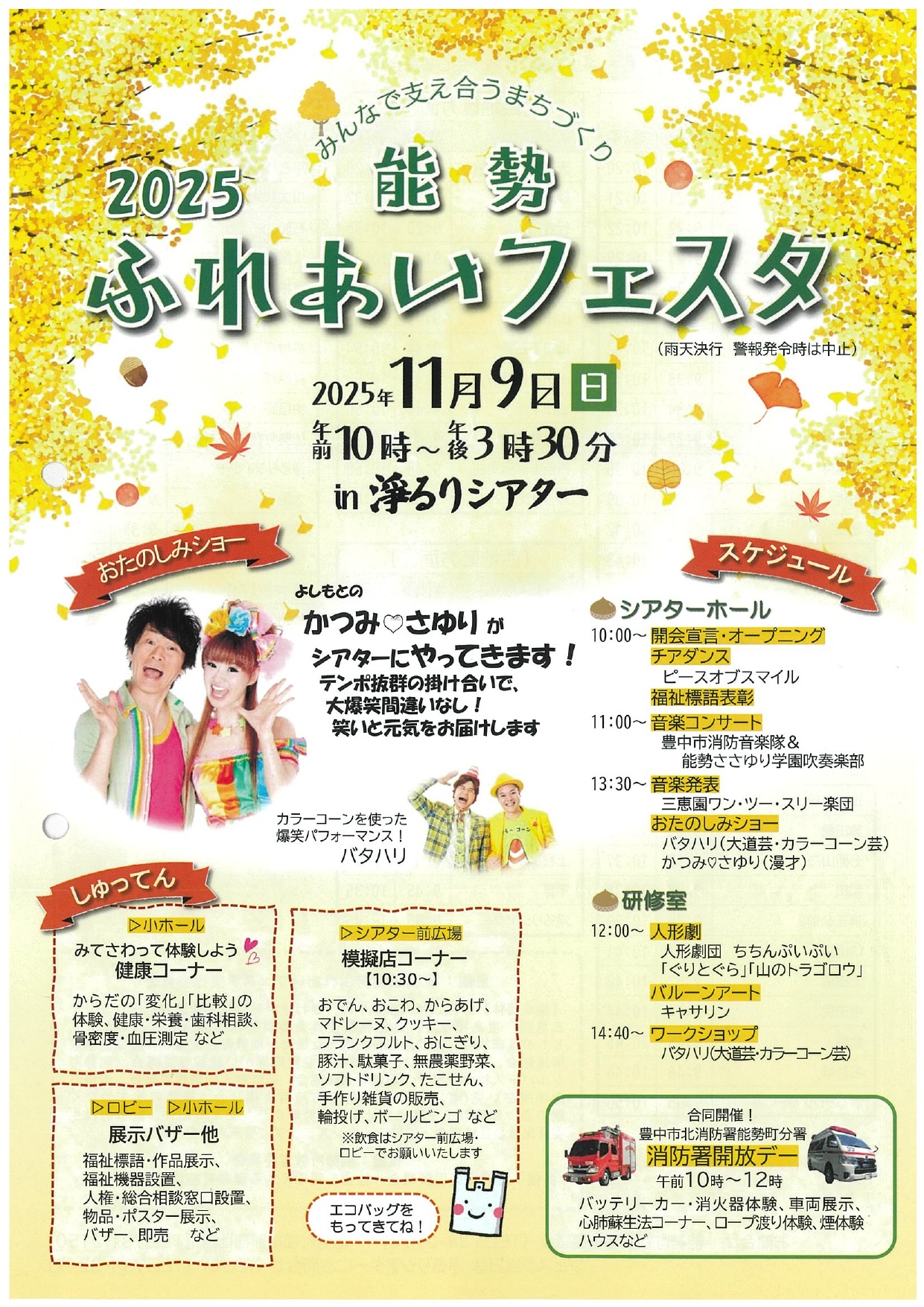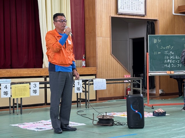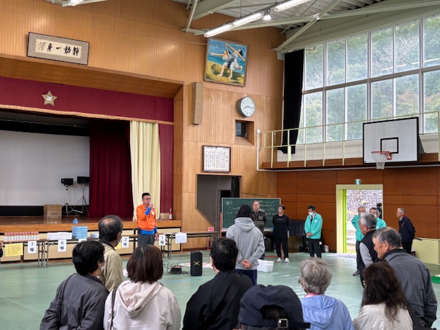 あいにくの雨により、西能勢地区体育祭が中止となりました。一方で、歌垣地区の第6回「ふれあい」まつりは、体育館でのプログラムが実施されましたので、参加させていただきました。子どもから高齢者まで楽しめる内容であり、観覧席が設けられるなど、見学だけでも参加できるように工夫されていました。最後には、お楽しみ抽選会や軽食の配布があり半日楽しめるイベントでした。
