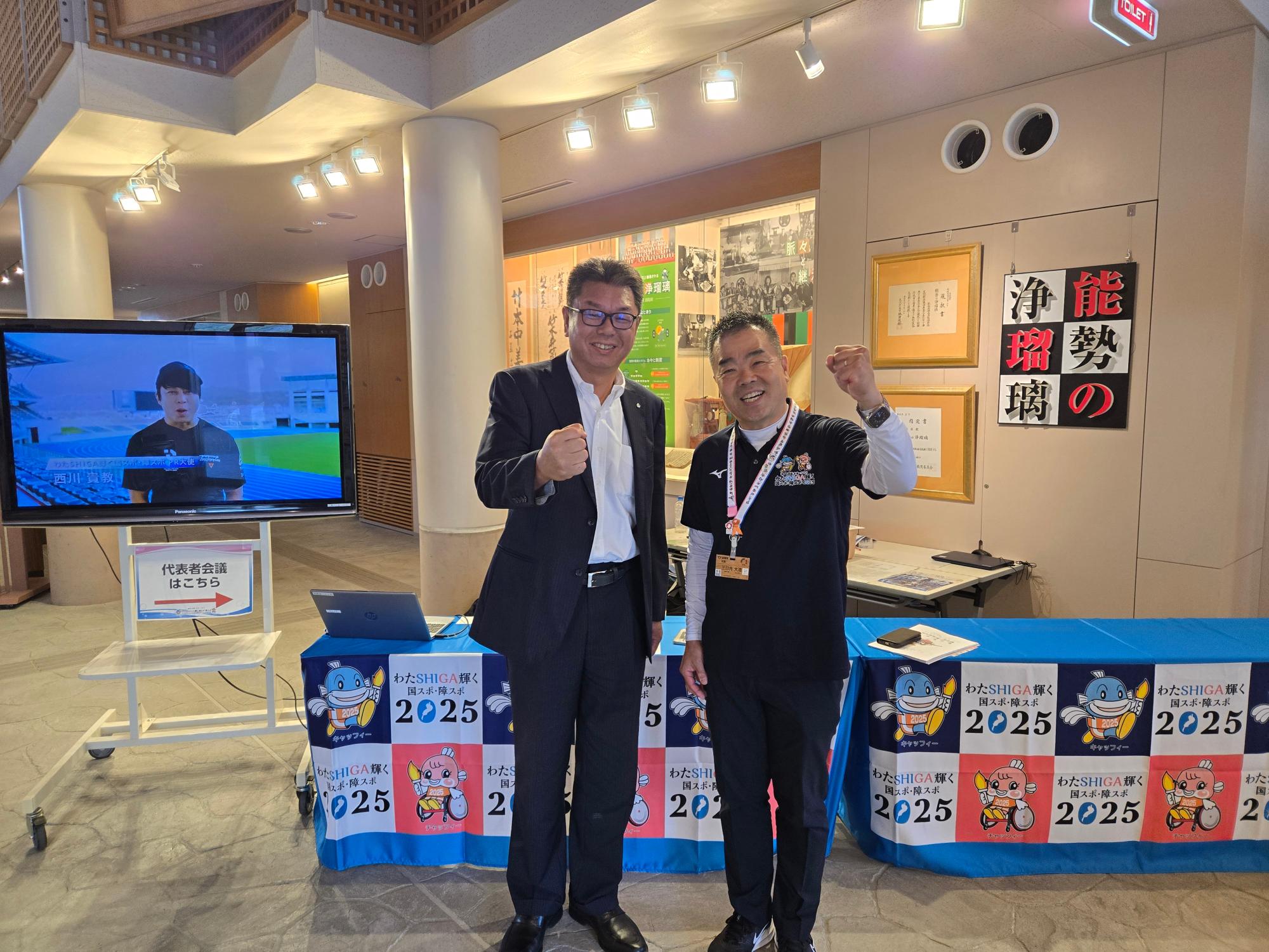 三日月滋賀県知事(右)へ大会がご盛会となりますようお伝えしました。
