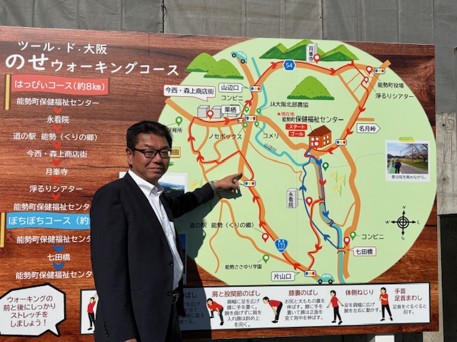その後、能勢町保健福祉センター前に設置しているウォーキングコースを掲載した看板のリニューアルが完了したため見学に行きました。以前と比較すると、びっくりするほど綺麗になってますので、一度立ち寄ってご覧ください。新たな健康の秘訣が見つかるかもしれませんよ。