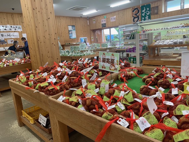売り場には新鮮な栗がたんさん並んでおり、今年は大変な豊作であるため、お買い求めいただきやすくなっています。栗ばかりか柿も豊作であるため、シカやイノシシが里山に多く出てくるのでしょうか。いよいよ能勢産米・シルク21の販売も始まり能勢町観光物産センターもより活気づいてきました。是非お立ち寄りください。