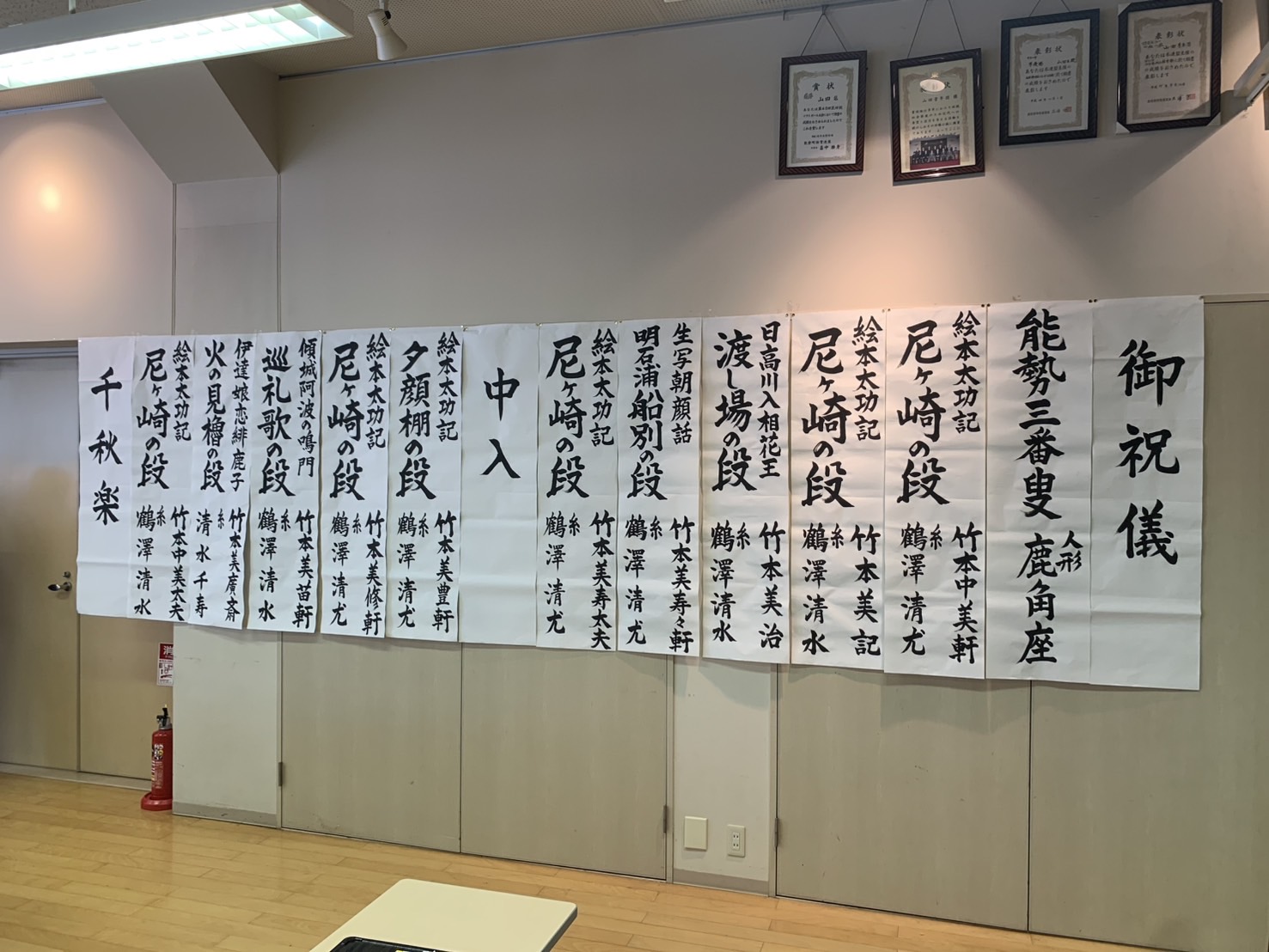今回、竹本中美太夫は第26代から第27代へと引き継がれます。午前中は式典が行われ、午後からは人形浄瑠璃鹿角座にはじまり10人の語り手が中入りを挟んで素浄瑠璃を語り、大トリに第27代中美太夫が語られました。その後に行われた懇親会を含めて11時間余りの立派な引継式でした。これぞ「能勢の浄瑠璃」であると、改めて痛感いたしました。