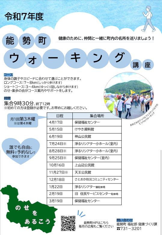 能勢町では毎月第3木曜日にウオーキング講座を実施しています。楽しみながら町内の名所を巡ることができますので、ぜひ一度参加してみてください。
