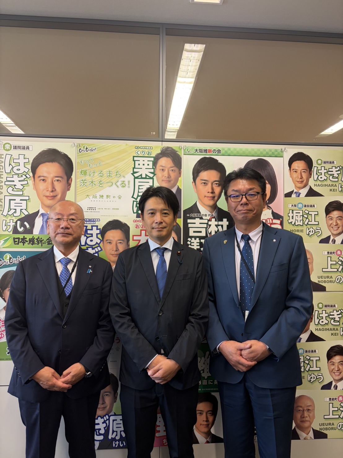 18日は、全国町村長大会に先立ち東京で開催される大阪府町村長セミナーに出席するため朝から出発しました。セミナーの前に豊能町長と共に大阪9区選出の萩原代議士を訪問し、豊能・能勢両町の過疎債等について意見交換しました。過疎債は過疎地域に指定された自治体が、過疎対策事業を行うために発行できる地方債のことです。有効に活用して過疎対策を進めていきたいと考えており、代議士に支援のお願いをしました。