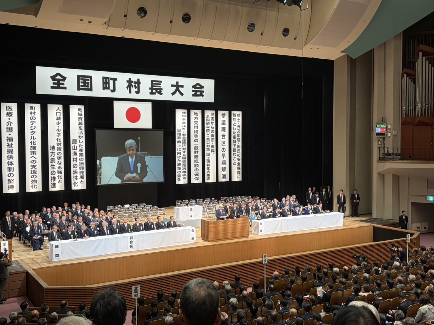 19日は、全国町村長大会がNHKホールで開催され、926町村の1人として出席しました。高市早苗内閣総理大臣を筆頭に衆議院・参議院の議長など多くの方から、「地方に力を注いでいく」という力強い来賓あいさつがありました。議事では決議や要望の内容を説明され満場一致で採択されました。