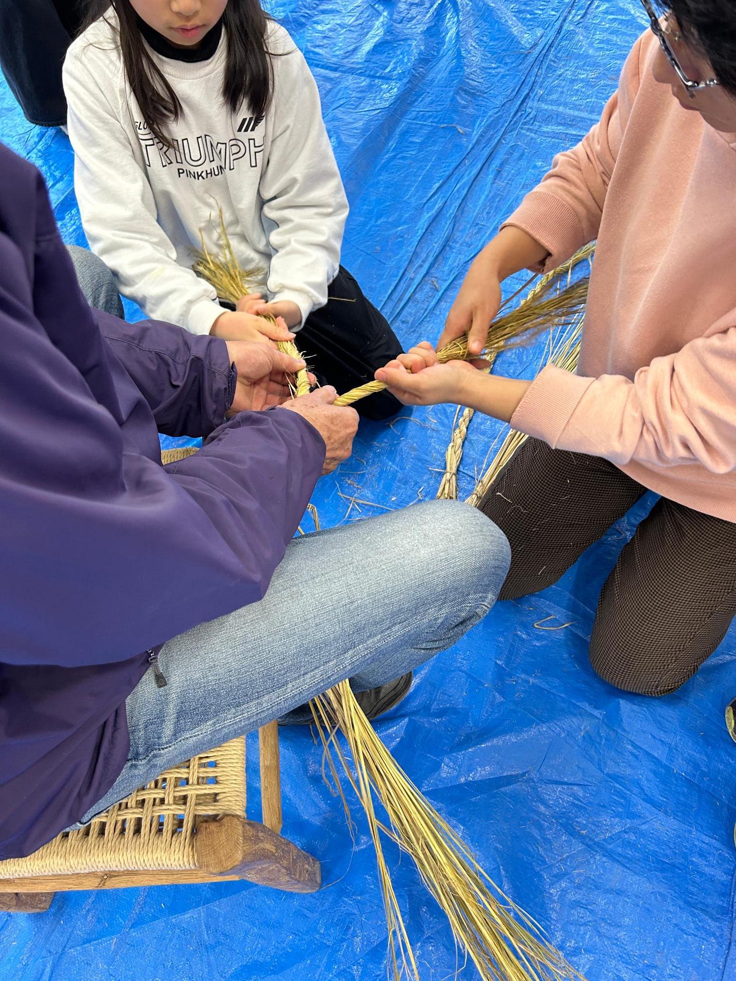 皆さんで協力し、藁で編んでリースを作ります