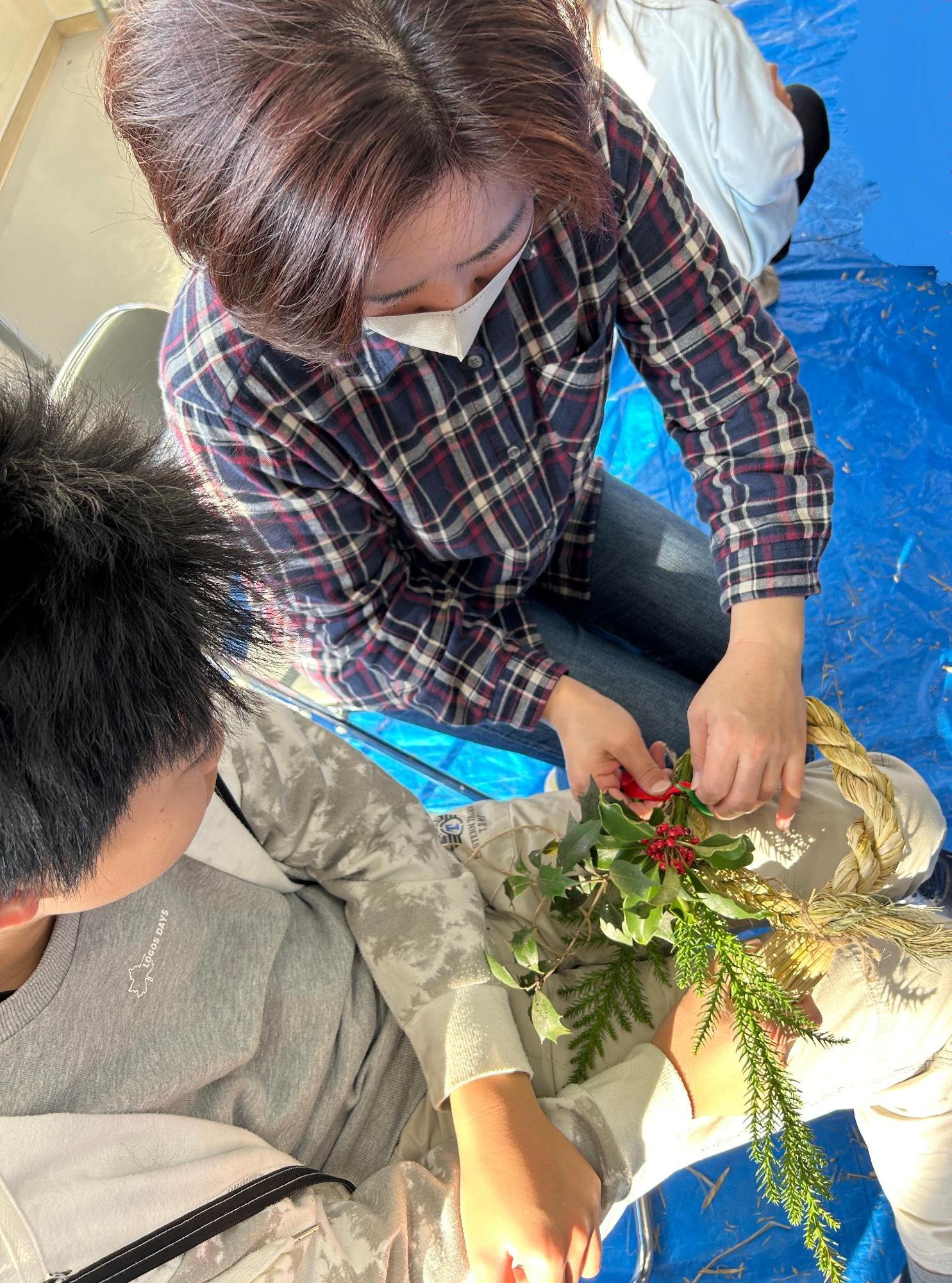 元古誠さんを講師にお迎えし、お互い協力をしながら和やかな雰囲気の中、藁でリースを作っていきました。杉や柊の葉、南天の実、リボンなど色鮮やかな飾り付けをし、皆さん素敵なリースに仕上げられていました。