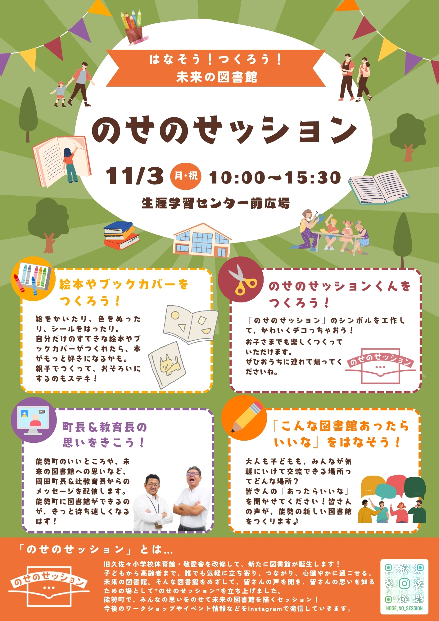 生涯学習センター前広場では、未来の図書館整備に向けた活動「のせのせッション」PR活動を行います。