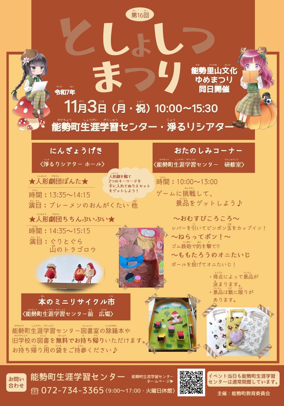 「第16回としょしつまつり」を「令和7年度 能勢里山文化ゆめまつり」と同時開催します。