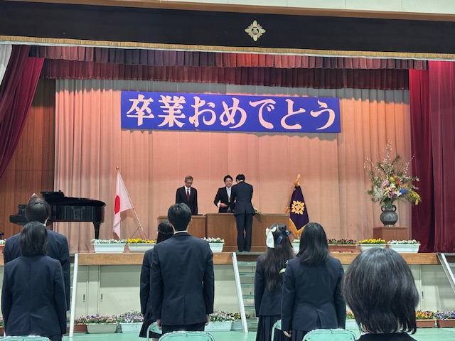 今日は豊中高校能勢分校の卒業証書授与式に出席しました。卒業生は20名でうち15名が能勢町在住という生徒たちのなか大阪市内から通学している生徒もいて、総合学科のすばらしさを改めて認識しました。准校長からの「今を生きる」の言葉、卒業生からのあらゆる面において「距離が近い学校」などの重みのある言葉に涙している方々がたくさんおられ、感動的な卒業証書授与式でした。