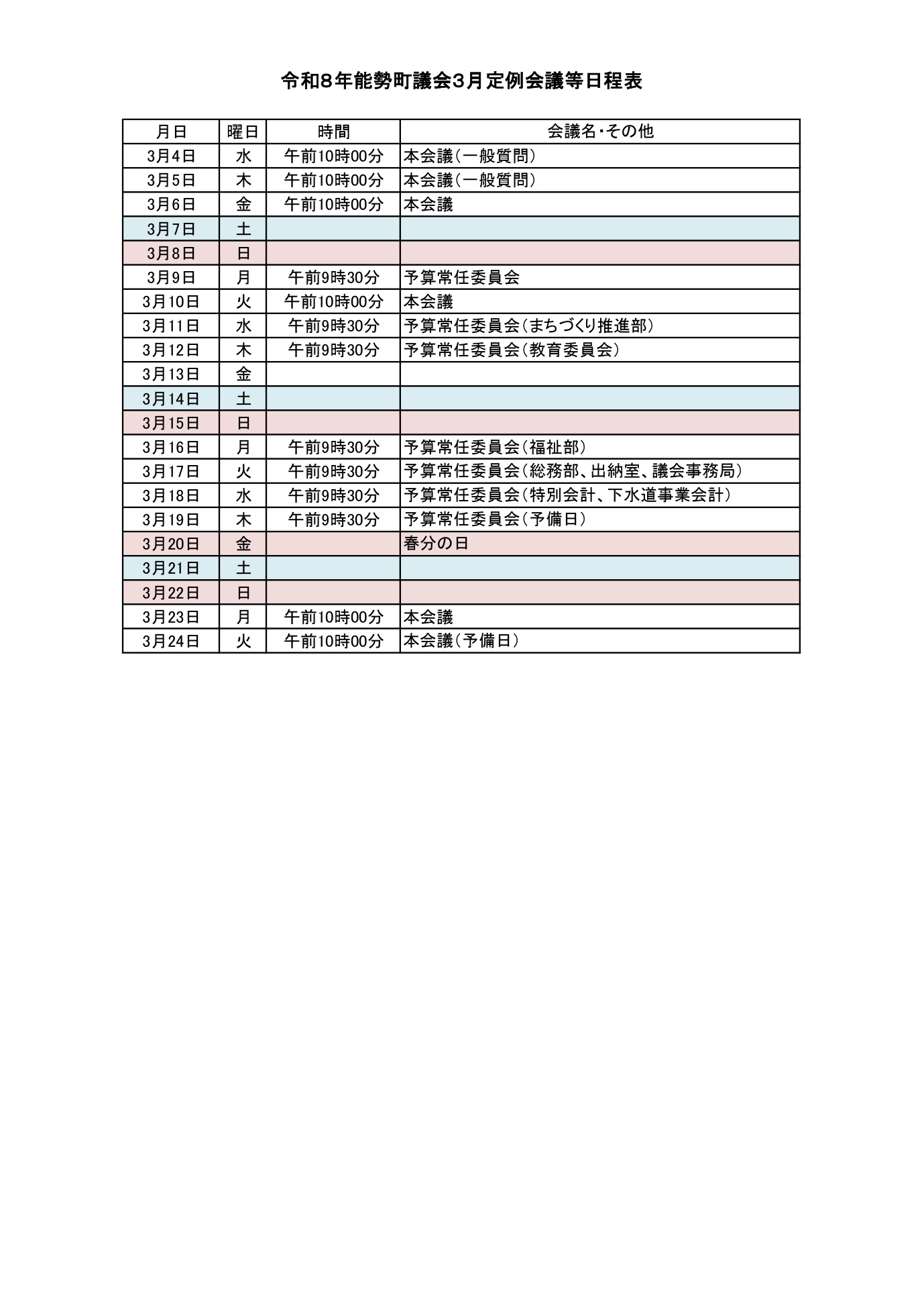 能勢町議会3月定例会議の日程は下記のとおり決まりました。是非傍聴にお越しください。