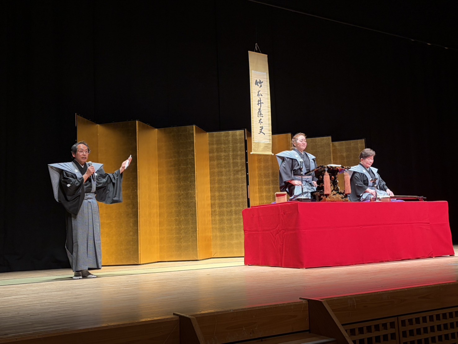 その後、淨るりシアターにおいて、竹本井藤太夫こと谷尾 剛氏の「門人稽古上げ」にお招きいただきましたので、郷土芸能保存会会長としてお祝いの言葉を申し上げました。谷尾氏は、平成19年から第43代竹本井筒太夫の門人としてこの道を志され、今日まで19年にわたり精進され「能勢の浄瑠璃」の発展に大きく寄与されています。今回はその門人である竹本井水こと中野祐子氏の稽古上げと相成りました。今後は語り部としての活躍が期待されるところです。式典の後、お二人の浄瑠璃を堪能させていただきました。