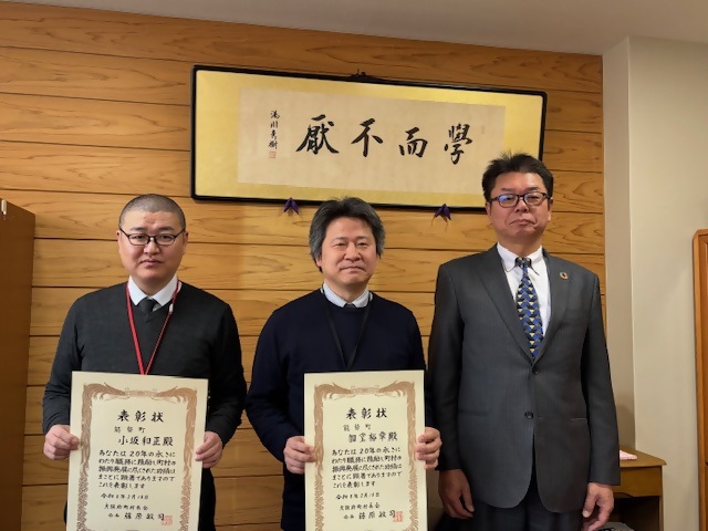 18日(水曜日)に開催された大阪府町村長会総会において自治功労者表彰を受章した本町職員2名に表彰状を伝達しました。在職20年の間には、様々な職場を経験して現在に至りますが、定年退職まであと20年と少し勤めるのは大変だなと労う気持ちで懇談しました。2人の活躍に期待しています。