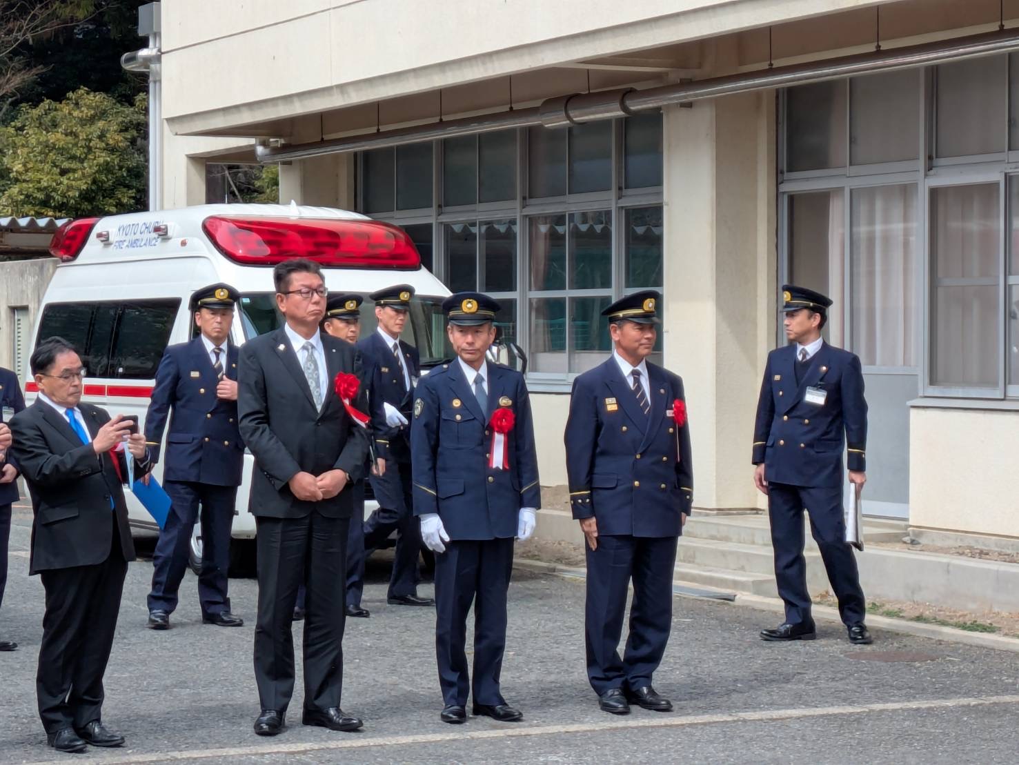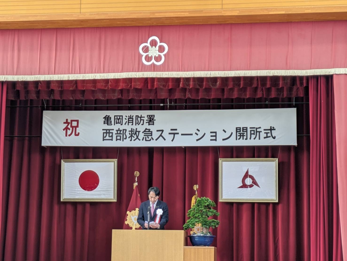 今日は、亀岡市に開設される、亀岡消防署西部救急ステーションの開所式に出席しました。本町と隣接する本梅地区の旧本梅小学校に開設される昼間の救急ステーションであり、有事の際にはお世話になることもあるため、お願い方々激励に伺いました。校舎の一部を事務所として改修されて救急隊を運用されるとのこと。地元では救急車の到着時間が大幅に短縮されるため、大変喜ばれていました。