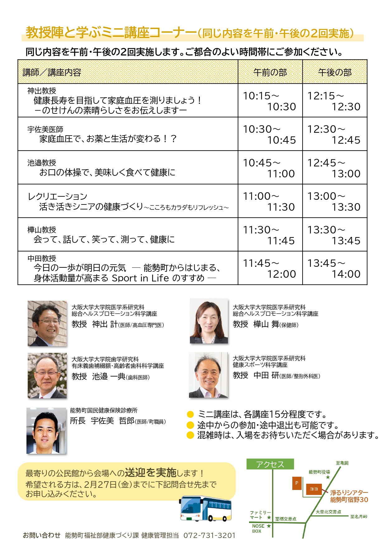 大阪大学の先生方に実施いただいた「健康にかかわるミニ講座」は、どの回も満席の盛況ぶりで健康への関心の高さがうかがえました。耳からのお薬が良く効いた気がします。人生100年時代において健康寿命が重要でありますので、それを伸ばす施策に力を入れていきたいと考えております。
