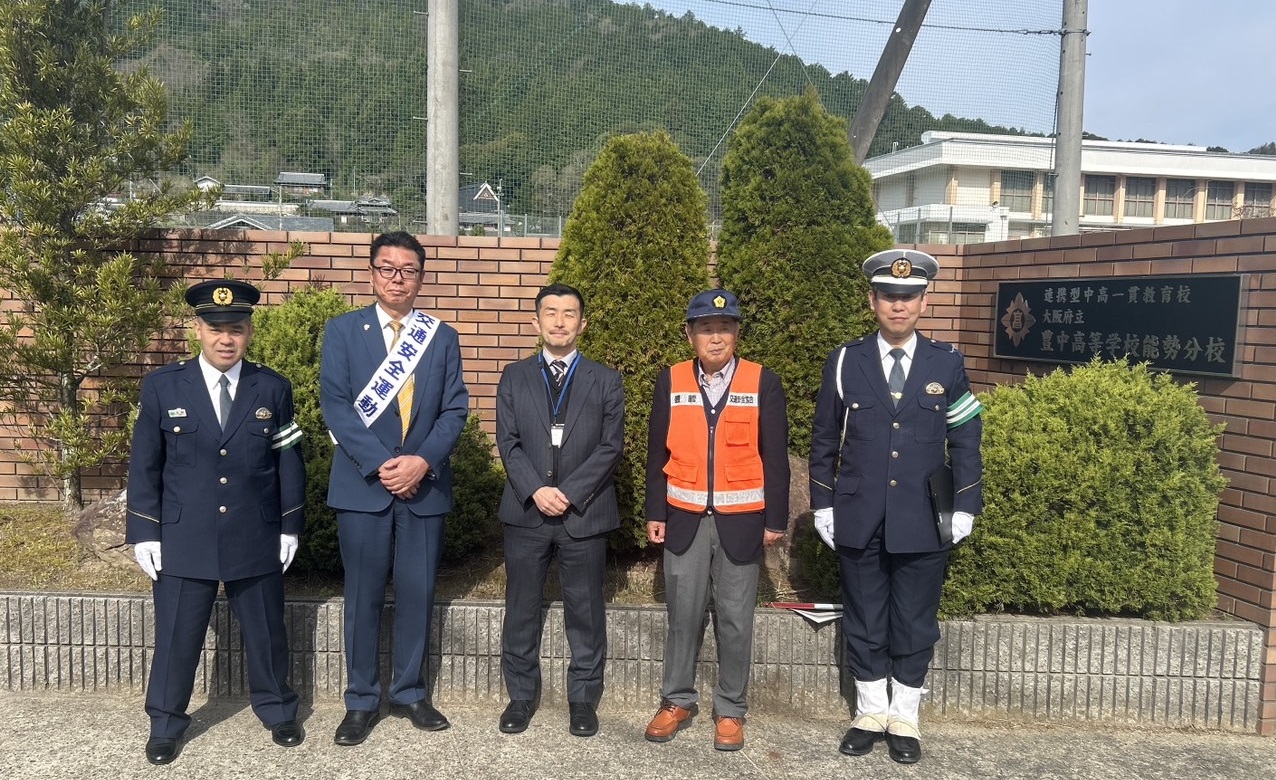 今日は春の全国交通安全運動で大阪府立豊中高校能勢分校へ行ってきました。PTA、豊能警察署の皆さん、准校長等と共に交通安全街頭指導をさせていただきました。