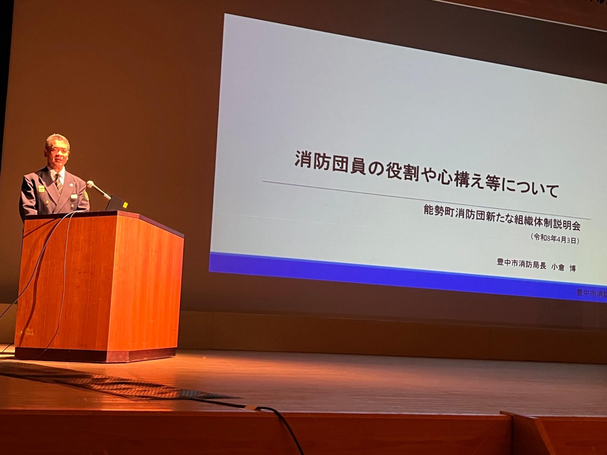 班長会議の後、全消防団員に出席いただき、新たな組織体制説明会が開催されました。改めて災害対応、出動方法、連絡体制などについて説明され、その後小倉豊中市消防局長から「消防団員の役割や心構え等について」と題した講演をしていただきました。東日本大震災などの教訓を例にわかりやすく説明いただきました。