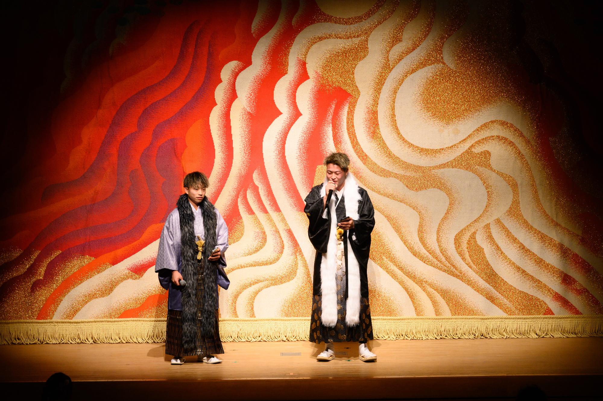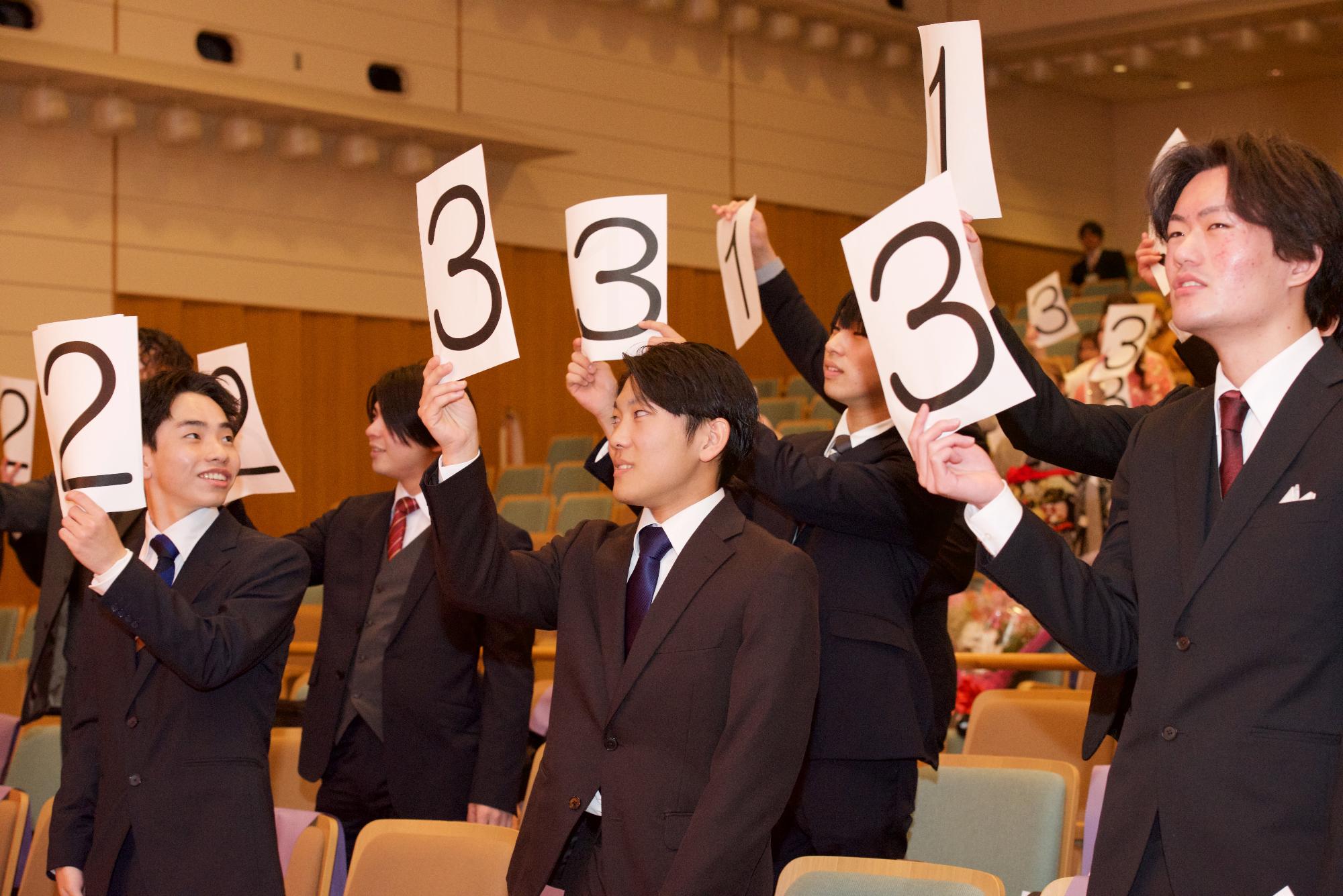 誓いのことばは運営委員を代表し、上奥千穂さんと前吾一さんが「どんな時も味方ででいてくれてありがとう。言葉では伝えきれないほどの支えと愛情に深く感謝します。私達はこれからの歩みが実り多いものになるよう、努力を積み重ねていくことを誓います」と力強く述べられました。その後は、運営委員司会のもとクイズ大会で盛り上がりました。